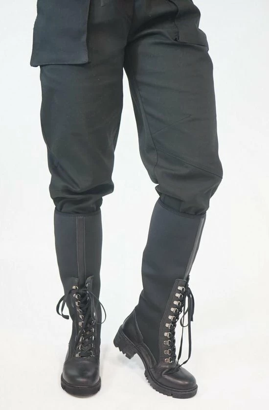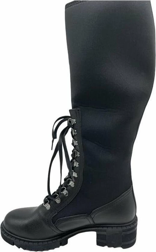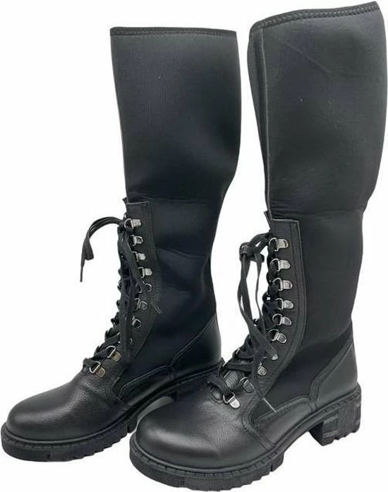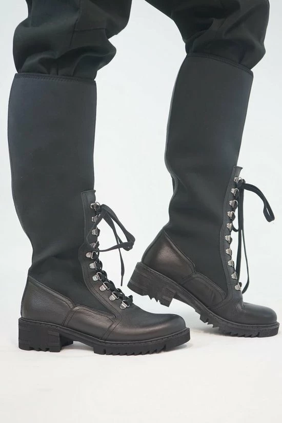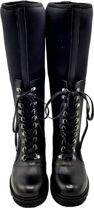 Deze hoge laarzen zijn heerlijk gevoerd en sluiten bovenin mooi af, dit zorgt voor warme voeten. Neopreen is een elastische warme stof. De veter zit door zilveren haakjes heen wat zorgt voor een chique look.