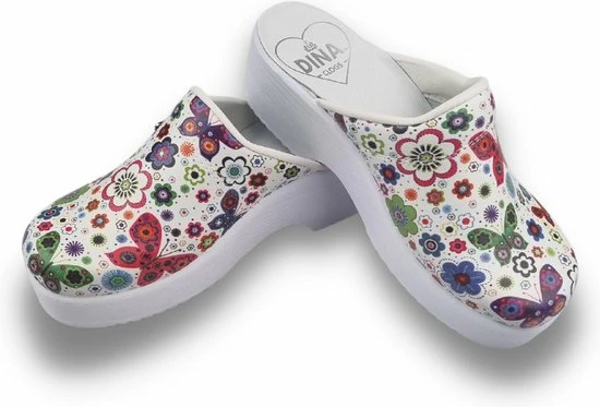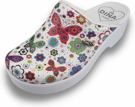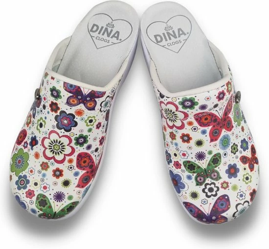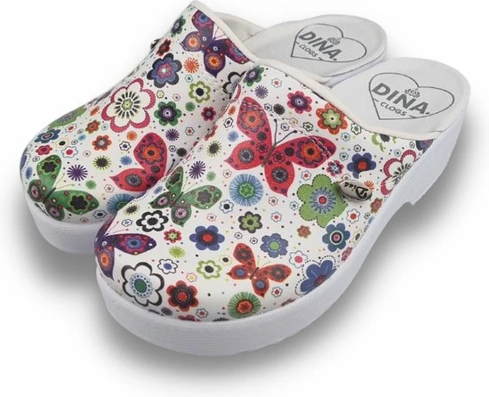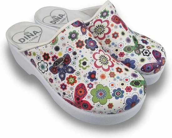Medische Dames Klompen PU Zool – PU Klompen Met Kunststof Zool – Ziekenhuis Klompen – Zorgklompen – DINA CLOGS – Vlinderbloemetjes – Maat 41