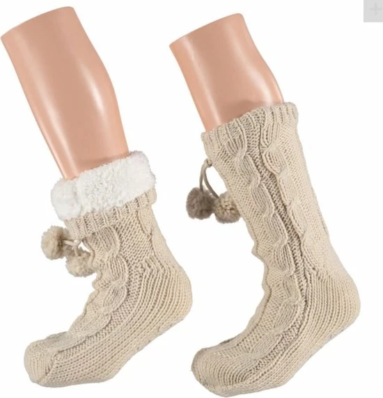 Licht Beige huissokken voor dames. Warme comfortabele huissokken met pompoms voor dames. De sokken hebben een zachte voering aan de binnenzijde en anti-slip aan de onderzijde. One size.