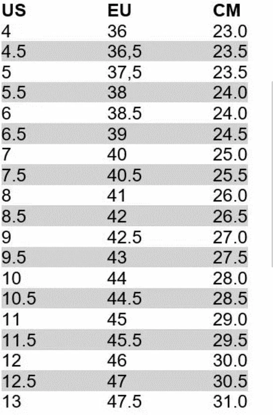 - Bij twijfel wordt geadviseerd om een (halve) maat groter te bestellen.