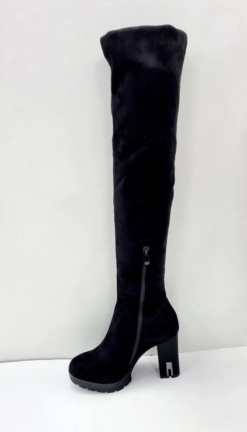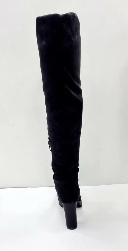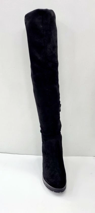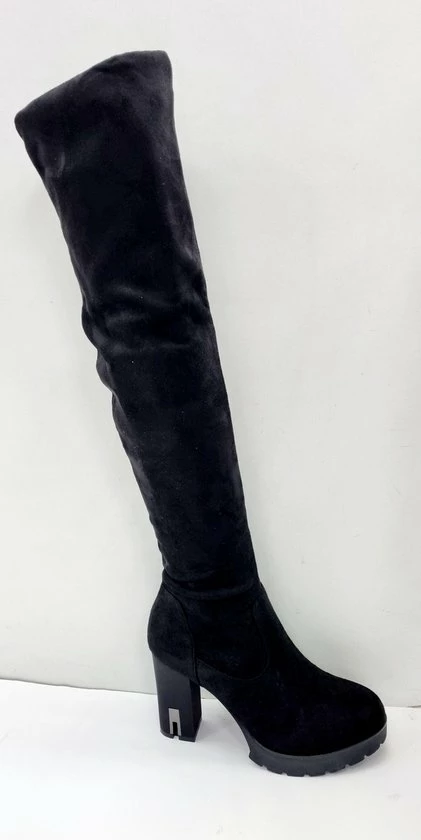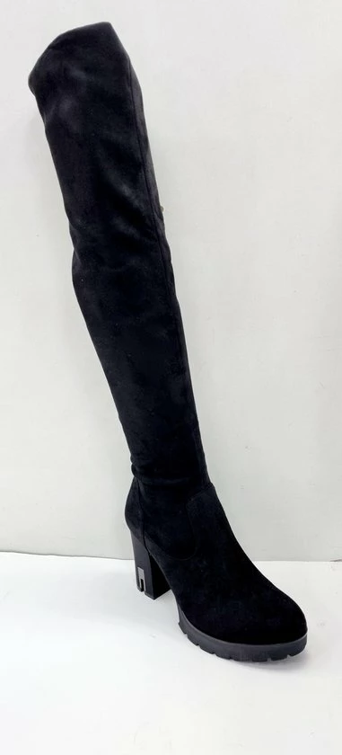 Modieuze overknee laars . Gemaakt van kunstsuede. Aan de binnenzijde bevindt zich een ritssluiting waardoor je gemakkelijk in kan schieten. Met detail in de hak . Verkrijgbaar in maten 36.37.38.39.40.41 .