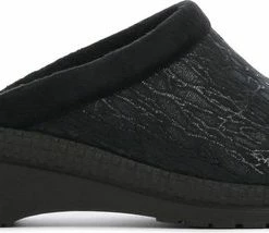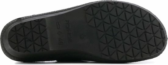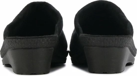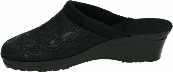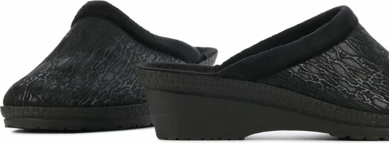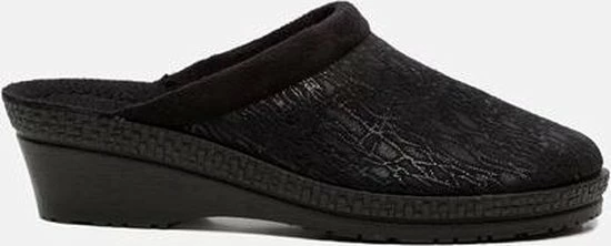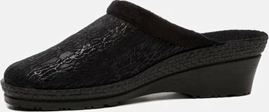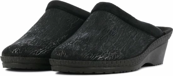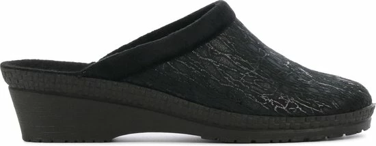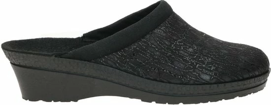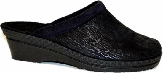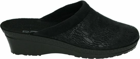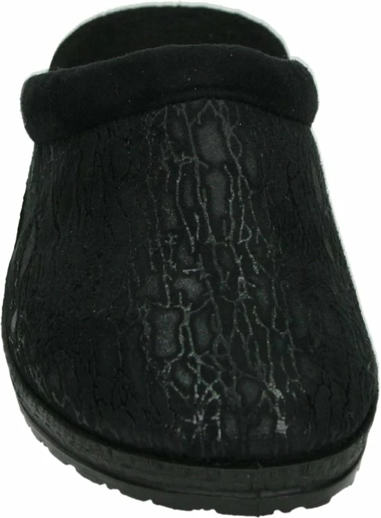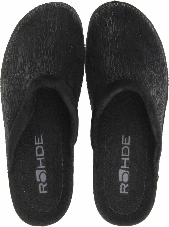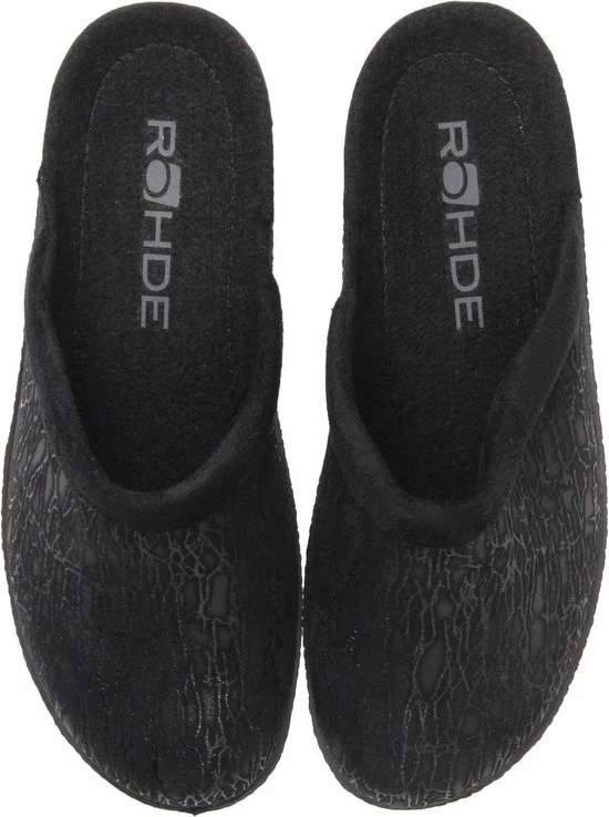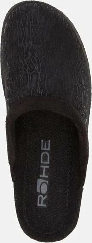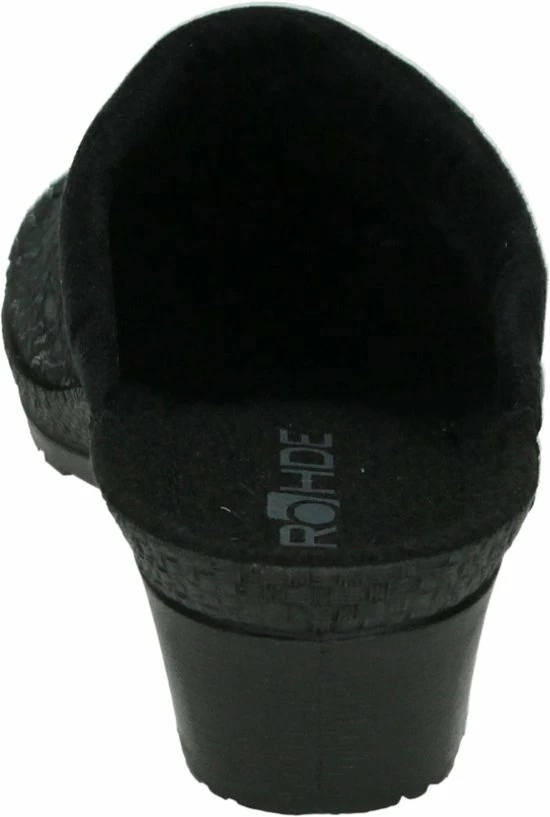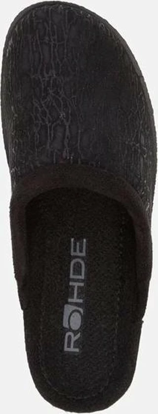 Zwarte suède pantoffel voor dames van het merk Rohde. Dit model muil is uitgevoerd met een zwart voorblad met een glinstering. De binnenvoering en het voetbed bestaan uit zacht textiel. De buitenzool bestaat uit rubber met motief aan de zijkanten en is aan de achterzijde circa 4 cm verhoogd.