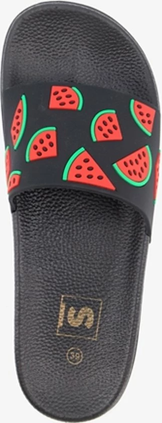 Zwarte badslippers met watermeloenen op de band voor dames. Voorzien van een comfortabel voetbed. De badslippers hebben een stevige, rubberen zool met voorgevormde groeven voor extra comfort.