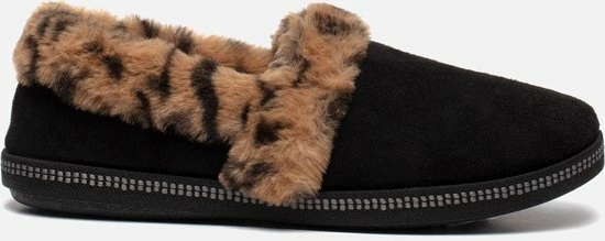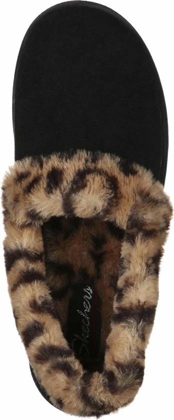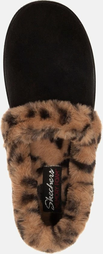 Zwarte Skechers pantoffels gemaakt van suède, met een voering en binnenzool van imitatiebont. Het bont is voorzien van een luipaardprint, wat de pantoffels een leuk effect geeft. Ter decoratie zijn er stiksels aangebracht. Het voetbed is voorzien van Memory Foam. Dit zorgt voor demping. De rubberen zool heeft een dikte van 1 centimeter.