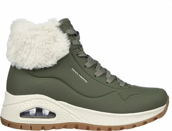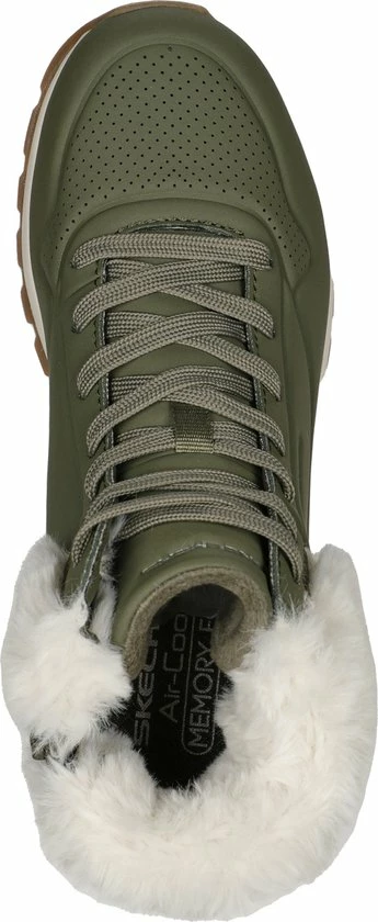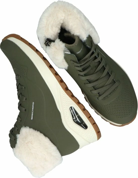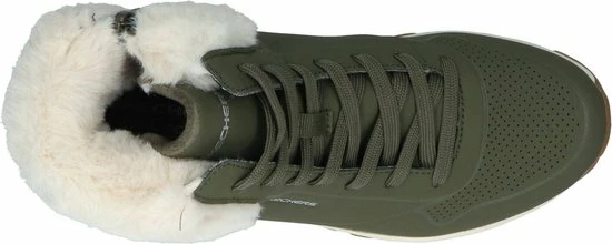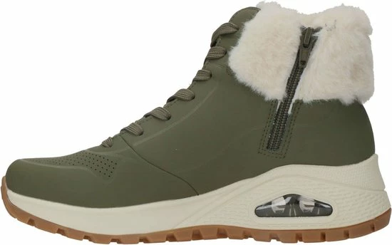 Skechers Uno Rugged groen sneakers dames Deze sportieve heerlijke warme sneaker is ideaal voor de koudere dagen. Binnenkant is voorzien van fake fur en heeft de bekende Air Cooled Memory Foam binnenzool. Aan de binnenkant zit een rits waardoor de schoen gemakkelijk aan en uit kan. Flexibele rubberen buitenzool met veel grip. Kleur: groenMateriaal bovenwerk: leer