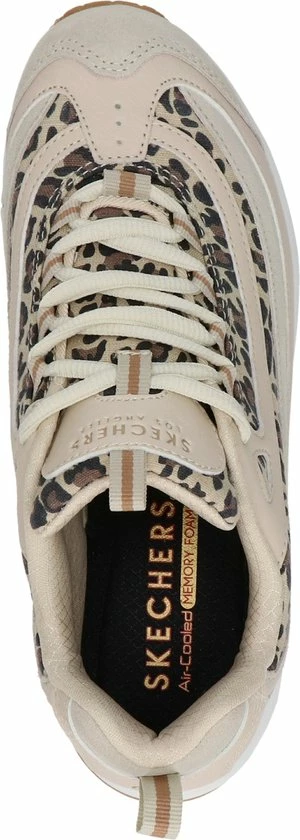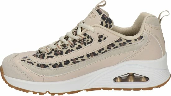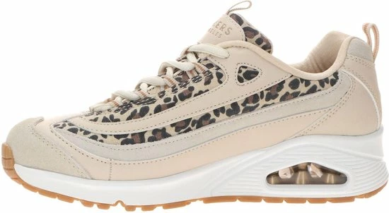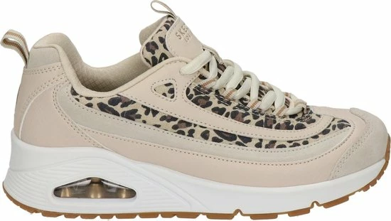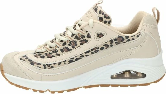 Deze Skechers Uno Wild Streets sneakers in de kleur beige zijn gemaakt van synthetisch materiaal. De voering en comfortabele binnenzool zijn gemaakt van textiel. Ter decoratie zijn er sierstiksels, merkopdrukken en inzetten met luipaardprint aangebracht, wat de sneakers een leuk effect geven. Door middel van veters en de lusjes zijn de schoenen gemakkelijk aan en uit te trekken. De chunky zool is gemaakt van rubber en zorgt ervoor dat de sneakers comfortabel lopen. Goed om te weten: het voetbed van deze Skechers Uno Wild Streets sneakers is niet uitneembaar.