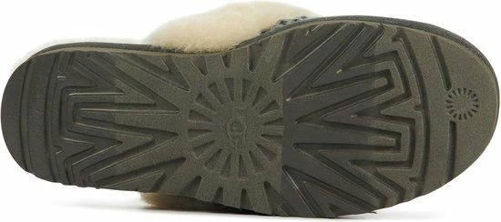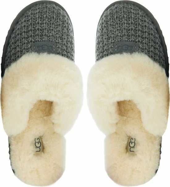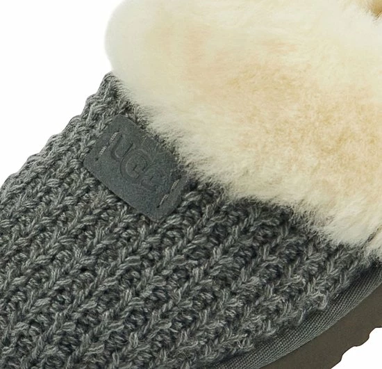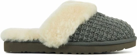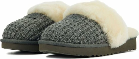 Damespantoffel model 1117659 in de kleur grijs van UGG Australia. Pasvorm Dit ontwerp van Ugg Australia valt normaal op maat. Beschrijving Grijze gebreide instap pantoffel met vacht voor dames van het merk UGG Australia. Deze instap pantoffel met ronde neus is uitgevoerd in gebreide stof en voorzien van een vacht over de wreef. De binnenvoering is tevens van vacht, wat zorgt voor lekkere warme voeten. Dit model heeft geen sluiting, maar kun je gemakkelijk aan- en uittrekken door de open achterzijde. Verder heeft de rubberen loopzool een grof profiel voor een stevige grip.