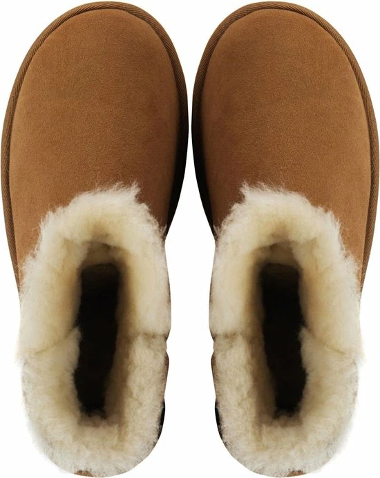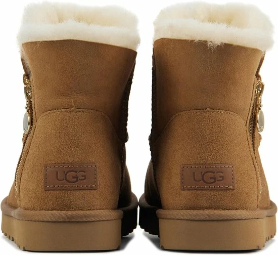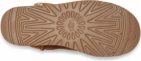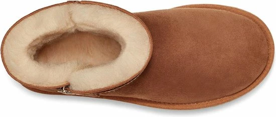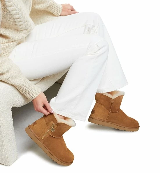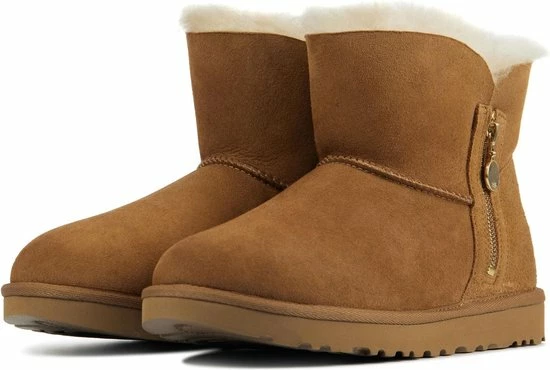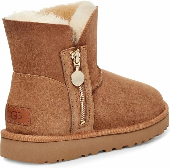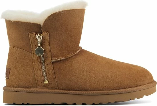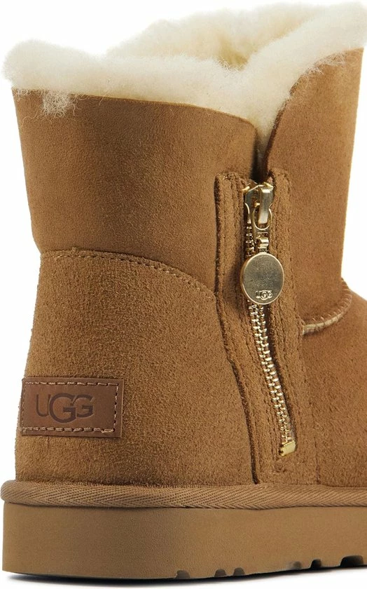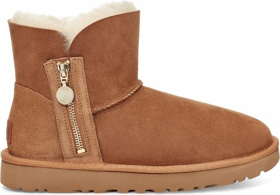 Dameslaars model Bailey Zip Mini in de kleur cognac van UGG. Pasvorm De ontwerpen van UGG vallen over het algemeen normaal op maat. Beschrijving Cognackleurige suède enkellaars voor dames van het merk UGG. Dit iconische model met rits aan de zijkant is aan de buitenkant vervaardigd uit suède en voorbehandeld met vlek- en waterafstotende middelen. De binnenvoering is gemaakt van het welbekende schaapswol waardoor de voeten altijd verwarmd zijn. Verder biedt de rubberen Treadlite by UGG™-zool extra demping en heeft deze een grof profiel voor een stevige grip.