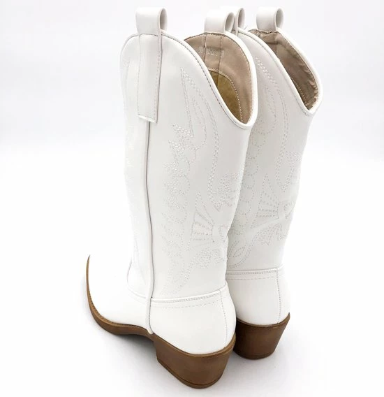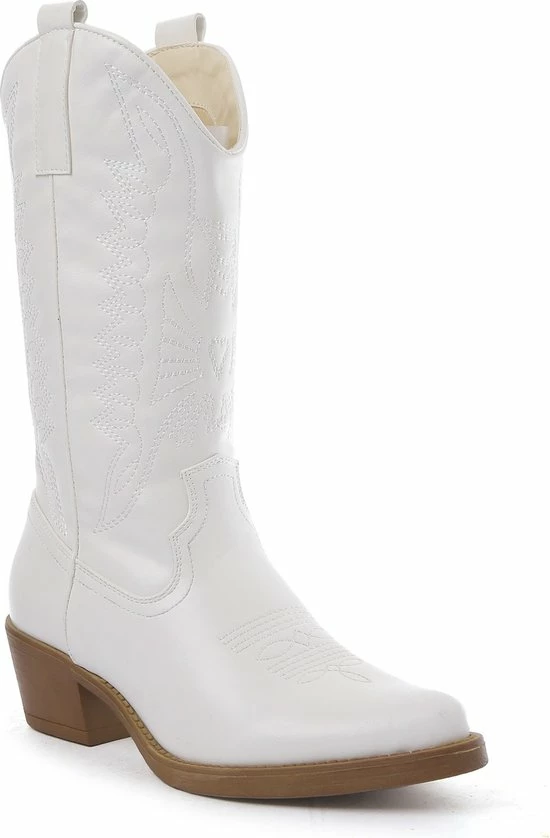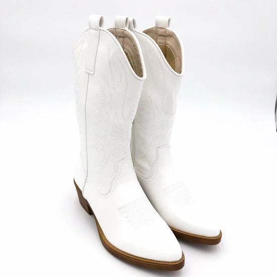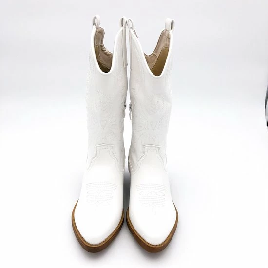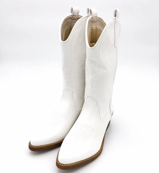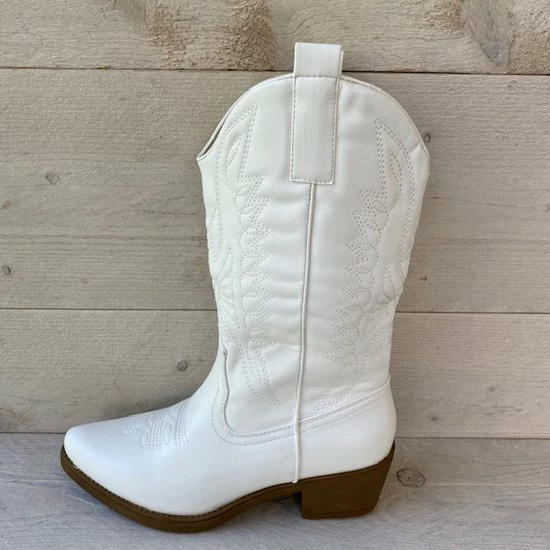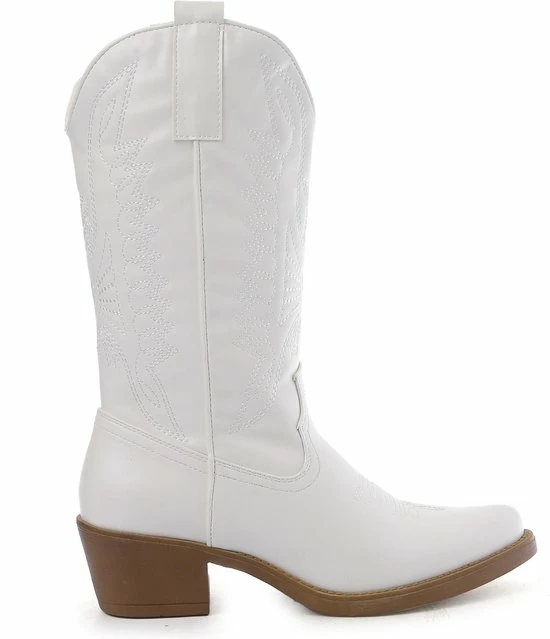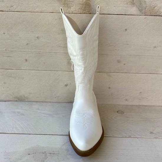 Witte Imitatieleren cowboylaarzen voor dames. Laarzen met stiksels afgewerkt met bruine zool. Verkrijgbaar in maat 36 t/m 41. Instaprits aan binnenzijde.